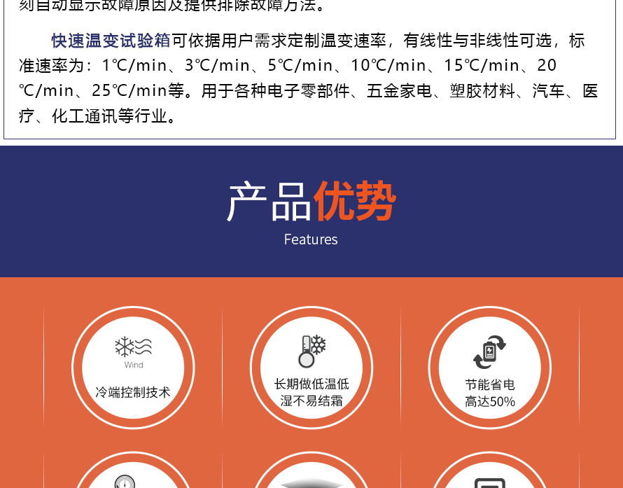 用途:快速溫變試驗箱主要用來測試各種材料耐熱、耐寒、耐干、耐濕的性能。本機(jī)采用中英文顯示彩色觸控式屏幕畫面,操作簡單,程序編輯容易,可顯示完整的系統(tǒng)操作狀況相關(guān)數(shù)據(jù)、執(zhí)