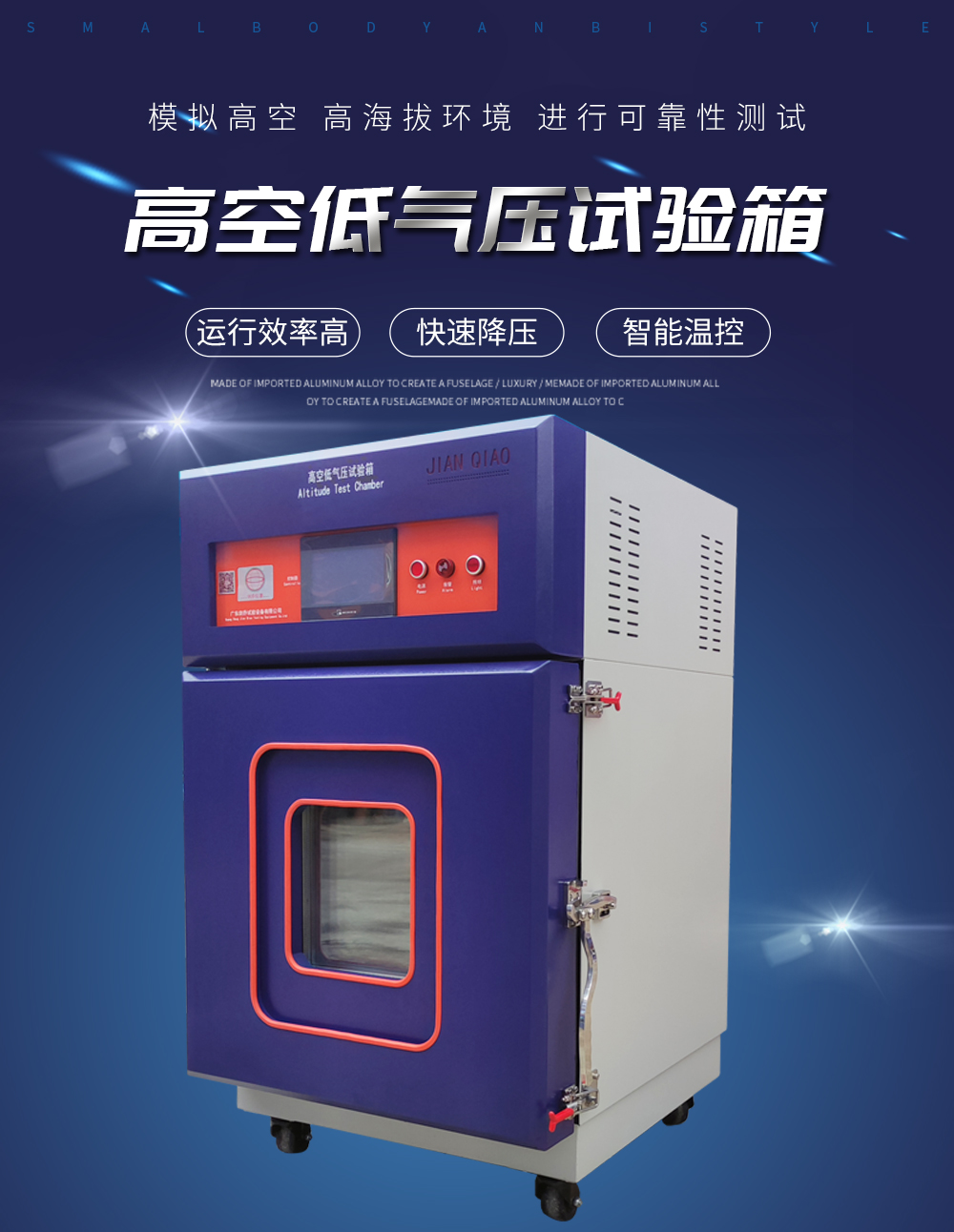 高空低氣壓試驗箱可以模擬高海拔、高空、(高原地區(qū))氣候進行貯存運用、運輸可靠性試驗,并可同時對試件通電進行電氣性能參數(shù)的測試設備。適用于國防工業(yè),航天工業(yè)自動化零組件,汽車部件,電池,平面顯示屏模組工業(yè)及相關產(chǎn)品料進行環(huán)境試驗 - 高溫試驗、低溫試驗、溫度變化試驗、低氣壓試驗、溫度高度試驗、低溫/低氣壓綜合試驗、高溫/低氣壓綜合試驗。