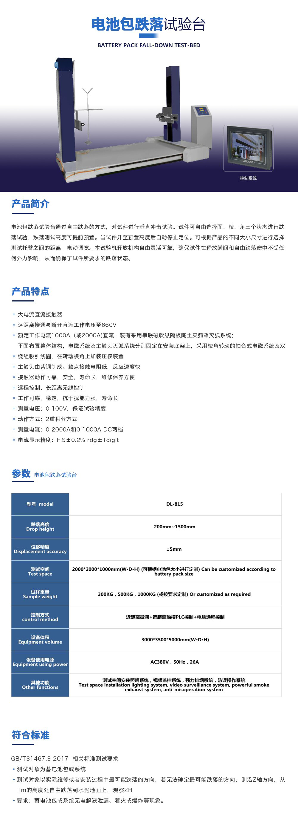產(chǎn)品型號(hào):JQ-F-815 品牌:劍 喬 用途:電池包跌落試驗(yàn)臺(tái)通過(guò)自由跌落的方式,對(duì)試件進(jìn)行垂直沖擊試驗(yàn)。試件可自由選擇面、棱、角三個(gè)狀態(tài)進(jìn)行跌落試驗(yàn),跌落測(cè)試高度可提前預(yù)置。當(dāng)試件升至預(yù)置高度后自動(dòng)停止定位咨詢熱線:13829135130