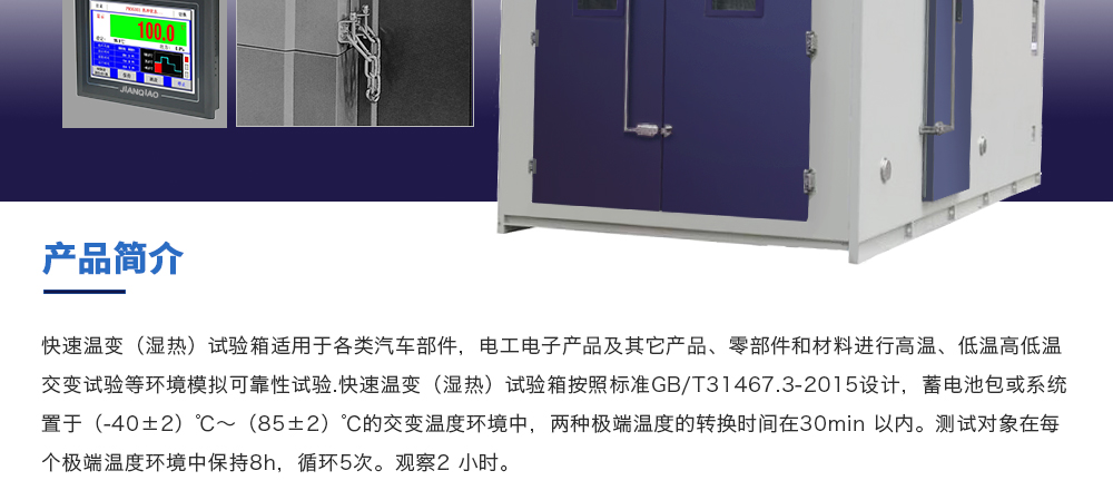 用途:快速溫變(濕熱)試驗箱適用于各類汽車部件,電工電子產品及其它產品、零部件和材料進行高溫、低溫高低溫交變試驗等環境模擬可靠性試驗.快速溫變(濕熱)試驗箱按照標準GB/T31