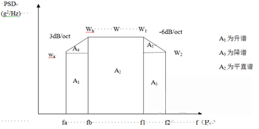 設w=wb+w1=0.2g²/Hz,fa=10Hz,fb=20Hz,f1=1000Hz,f2=2000Hz,由于fa 的wa 升至fb 的wb 處,斜率是3dB/oct,而wb=0.2g²/Hz,所以wa=0.1g²/Hz。